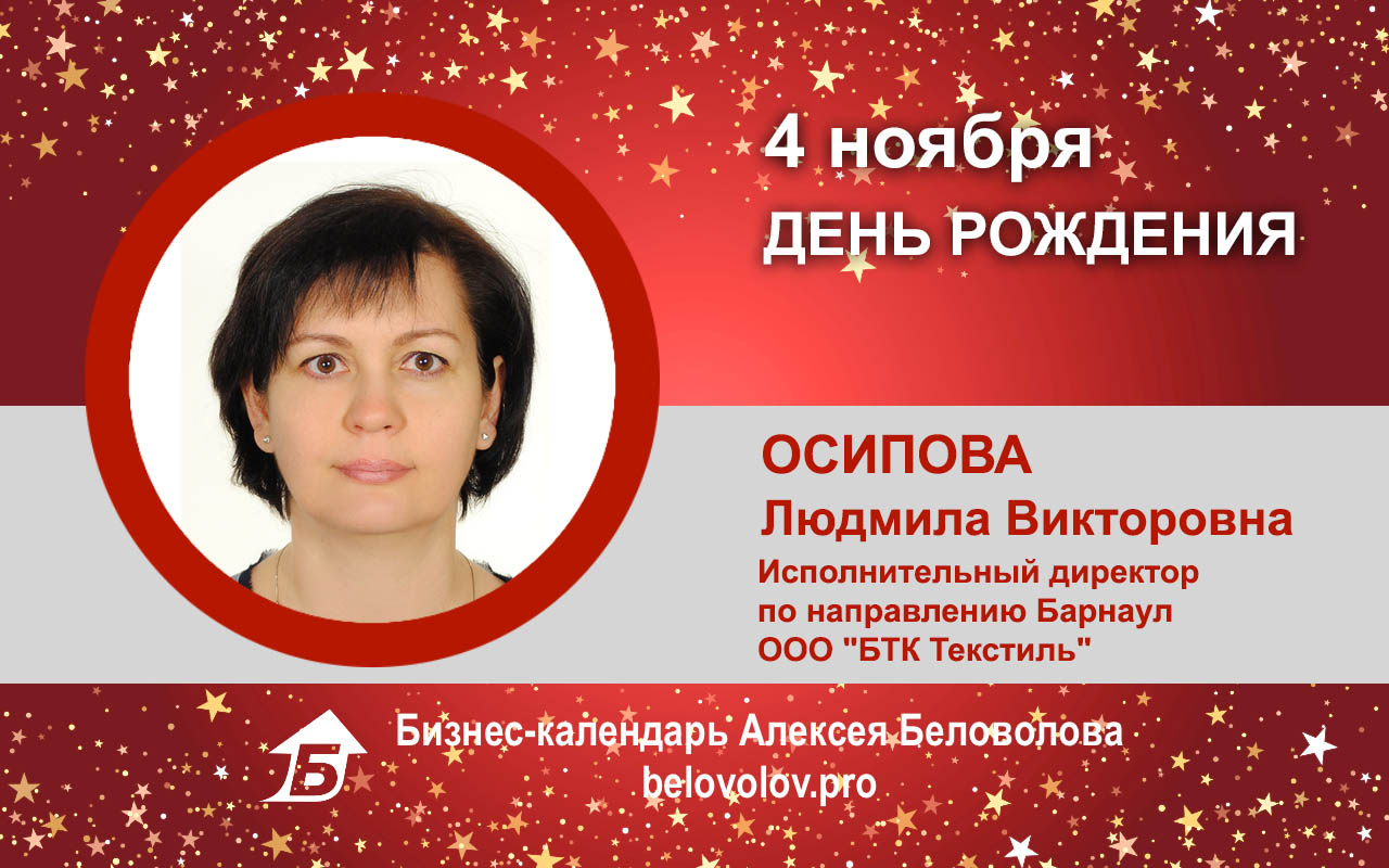 Сегодня День Рождения у исполнительного директора по направлению Барнаул ООО «БТК Текстиль» Осиповой Людмилы Викторовны!